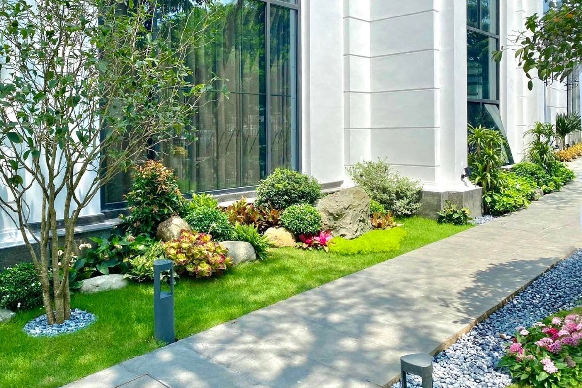 Đường dạo, bồn cây, tiểu cảnh nên ưu tiên đường cong mềm mại thay vì hình khối sắc cạnh. Điều này giúp: